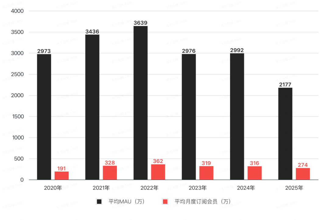 同期,其平均月度订阅会员也从2024年的316万收缩至客岁的274万。这意味着,其中枢付费东说念主群也在同步裁减。