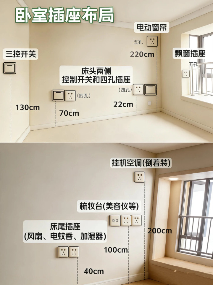 床头两侧:离地22-70cm傍边,比床头柜略高。漠视选带USB或Type-C口的插座,手机、平板、腕表齐能充。别忘了双控开关,门口和床头齐能关灯。能够装置智能开关,床头单独作念一个无线开关。