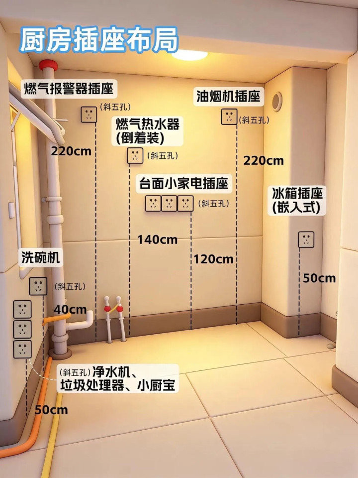 其他:清水器、垃圾处罚器、洗碗机,齐要在对应橱柜里面预留插座。