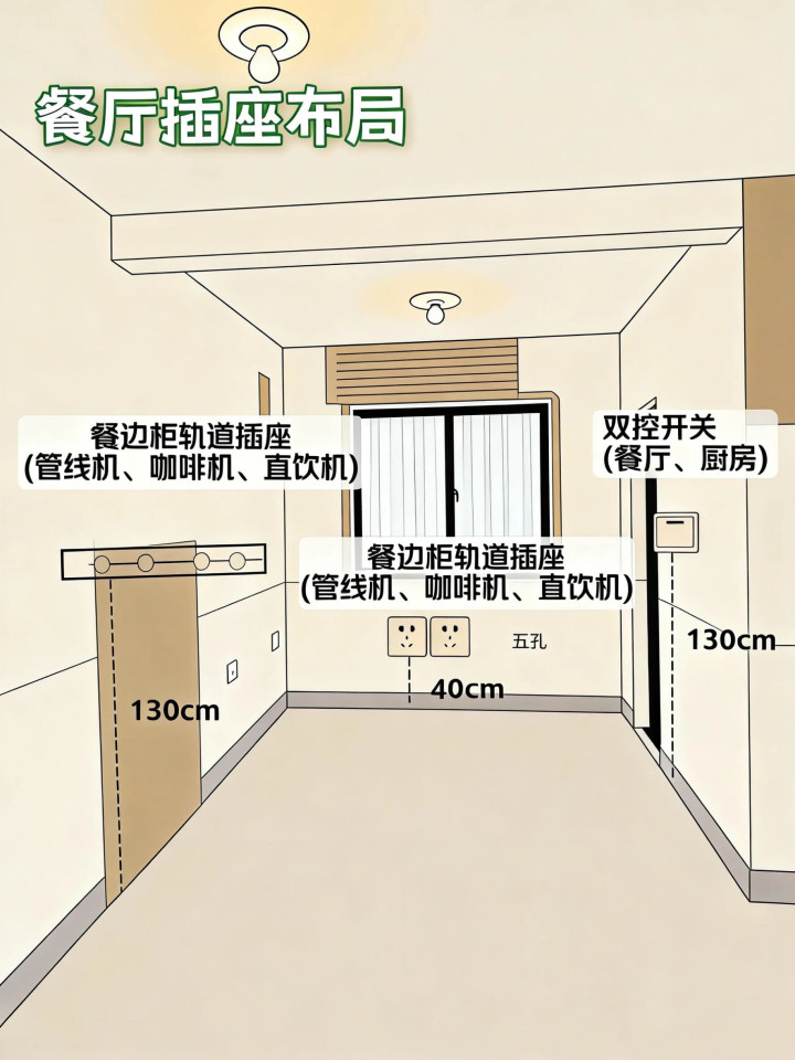 餐厅最灵巧的作念法:餐边柜上方装轨说念插座。离地120-130cm,轨说念可出动、可旋转,烧水壶、咖啡机、面包机同期用齐不打架。比起固定插座,轨说念插座活泼太多了。