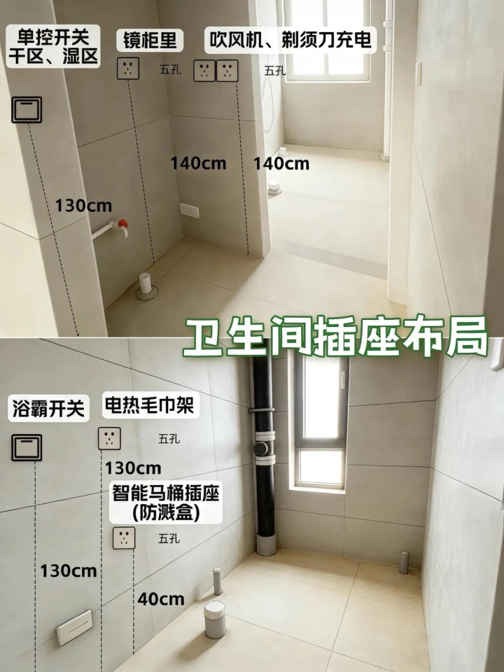 镜柜旁:离地130-150cm,给电动牙刷、剃须刀、吹风机用。吹风机插座漠视带开关。