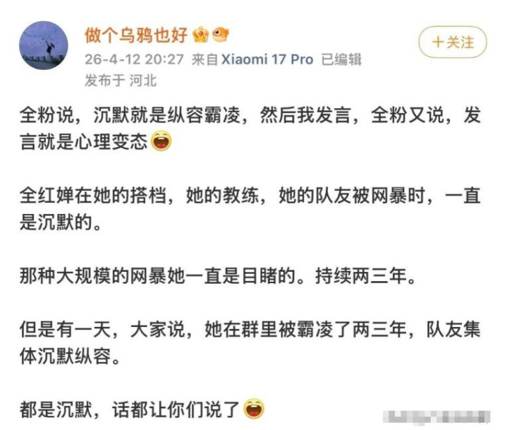4月11日变本加厉,造谣全红婵让锻练、搭档、队友都在光辉之下,还责备全红婵不敢为锻练、队友说公正话,放纵霸凌,把队友当成叩门砖。