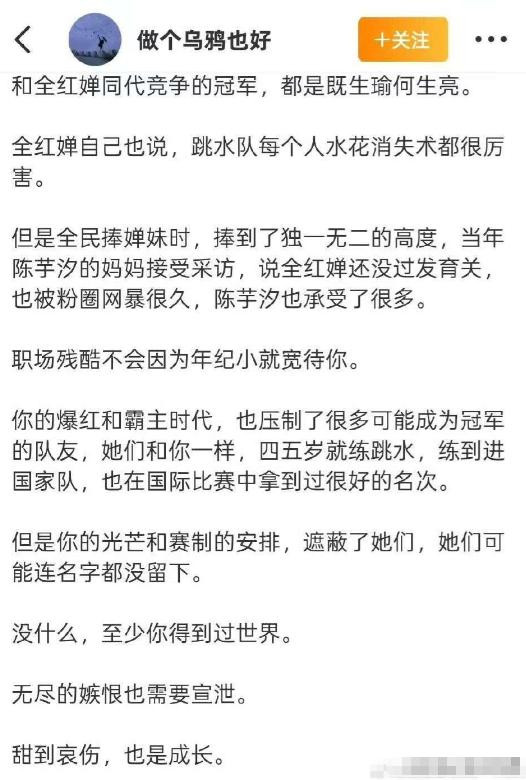 为了让我方的挑拨显得像模像样,她还抛出“体育圈亦然职场,越顶尖越卷”的论调,说全红婵爆红压制了陈芋汐、张家皆等队友发展,两东谈主即是既生瑜何生亮,刻意制造认识员之间的矛盾。