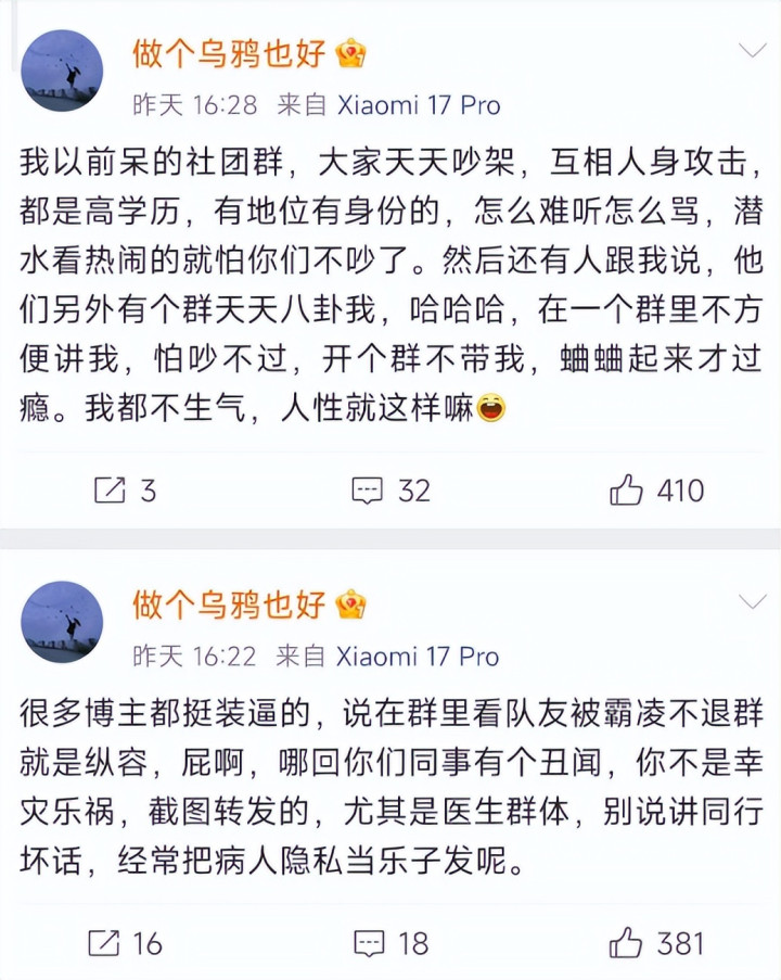 以致还大炫耀皮地说我方往常待的社团群天天吵架、彼此东谈主身抨击,高学历有地位的东谈主都这样干,全红婵报警即是小题大作念,东谈主性本就如斯。