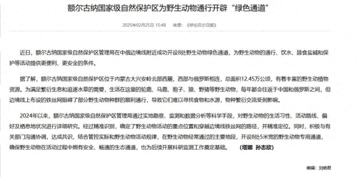 《额尔古纳国度级当然保护区为野纯真物通行开导“绿色通说念”》,内蒙古新闻网