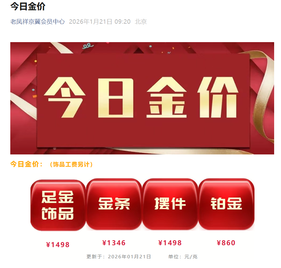 与此同时,国内金饰价格持续上涨,多品牌金饰克价站上1490元,再创近期新高。中新经纬查询发现,21日,周生生金饰报价1495元/克,单日上涨41元;老凤祥报价1498元/克,单日上涨42元/克;老庙黄金报价1493元/克,单日上涨38元/克。