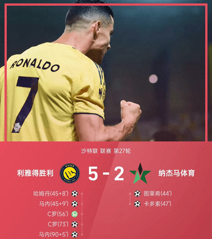 4月4日 25/26赛季沙特联联赛第27轮,利雅得得胜5-2治服纳杰马体育。上半场尾声阶段,图莱希破门匡助纳杰马体育赢得来源,随后哈姆丹与马内补时两分钟内连入两球,利雅得得胜半场2-1来源。易边再战,开场仅2分钟,卡多索便赢得进球匡助纳杰马体育2-2扳平比分。随后,C罗梅开二度,匡助利雅得得胜再次开辟上风。补时阶段,马内赢得进球,匡助利雅得得胜将比分定格在了5-2。积分方面,利雅得得胜70来源第二名眉月6分领跑!