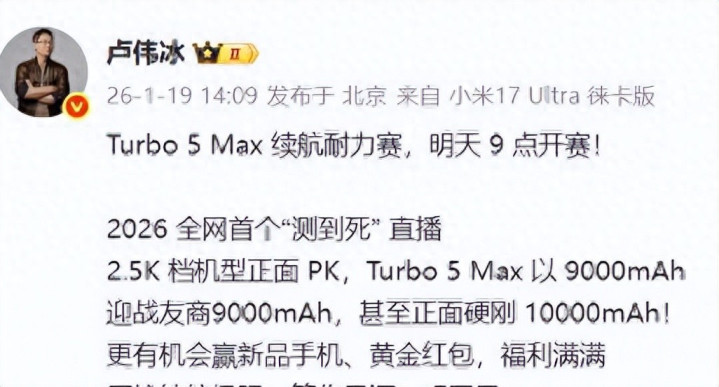 卢伟冰又放话了,1月19日官宣,2026全网首个测到死直播要来,Turbo 5 Max续航耐力赛,明天早上9点开赛,全天开测,真刀真枪,不熄屏,不歇气,敢不敢看一整天?