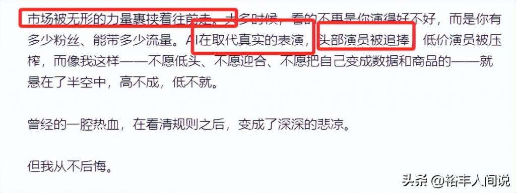 长文中,李田野说谈:阛阓被无形的力量裹带着往前走。大多时候,看的不再是你演得好不好,而是你有几许粉丝、能带几许流量。AI 在取代信得过的上演,头部演员被追捧,廉价演员被压榨……