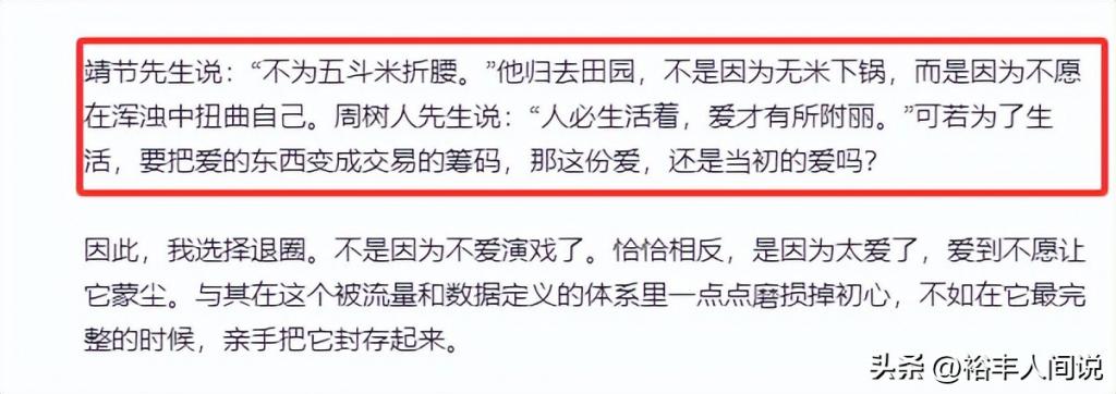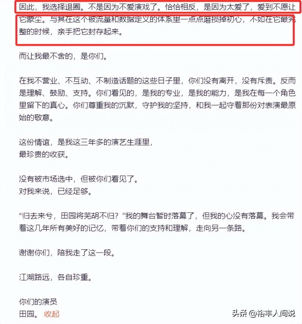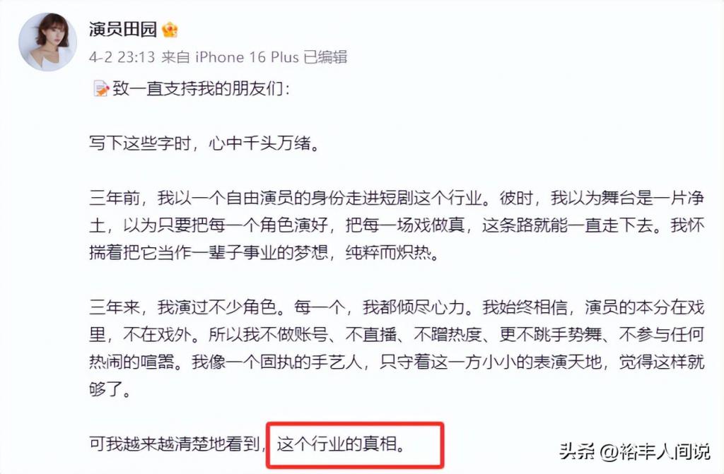 4 月 3 号,短剧演员李田野发布退圈声明,并详备证明了我方的初志以及当下的无奈,不同于其他演员的作念法,她在长文中专诚提到了“沾污、悲惨、不肯折腰、不肯相合、廉价演员、数据、商品”等等。