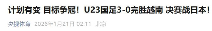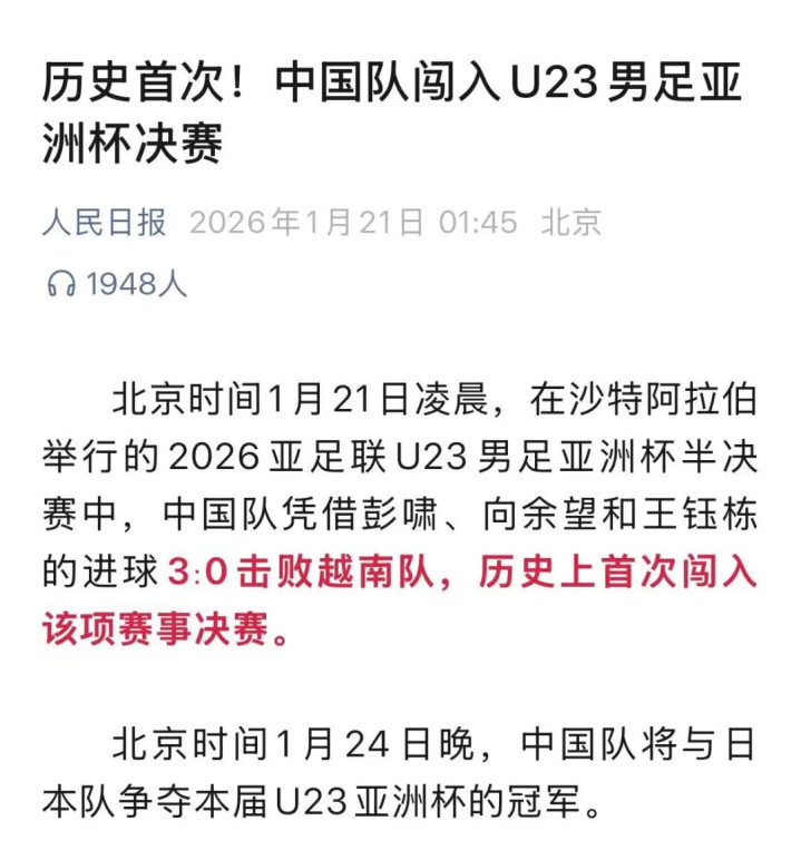 北京时间1月21日凌晨,在沙特阿拉伯举行的U23男足亚洲杯半决赛中,中国队3:0大胜越南,历史上首次闯入该项赛事决赛。熬夜看球的球迷们瞬间沸腾,话题直接刷屏社交平台。