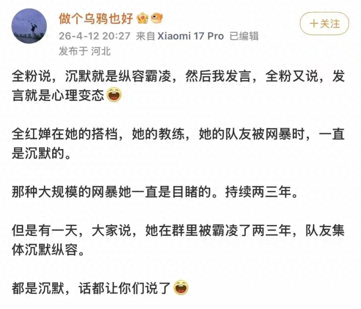 她话里话外都在暗意,全红婵的粉丝太猖獗,而全红婵本东说念主对此“千里默”了太久,纵容了这种霸凌。这种逻辑很精深,把一个畅通员无法截至的事情扣回到她头上——粉丝的行为,凭什么要让全红婵来细致?