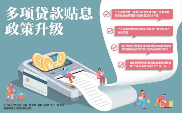 1月20日,财政部等连发多项贷款贴息政策,对此前个人消费贷款、服务业经营主体贷款、设备更新贷款三项贴息政策进行了优化,还新增实施中小微企业贷款贴息政策。