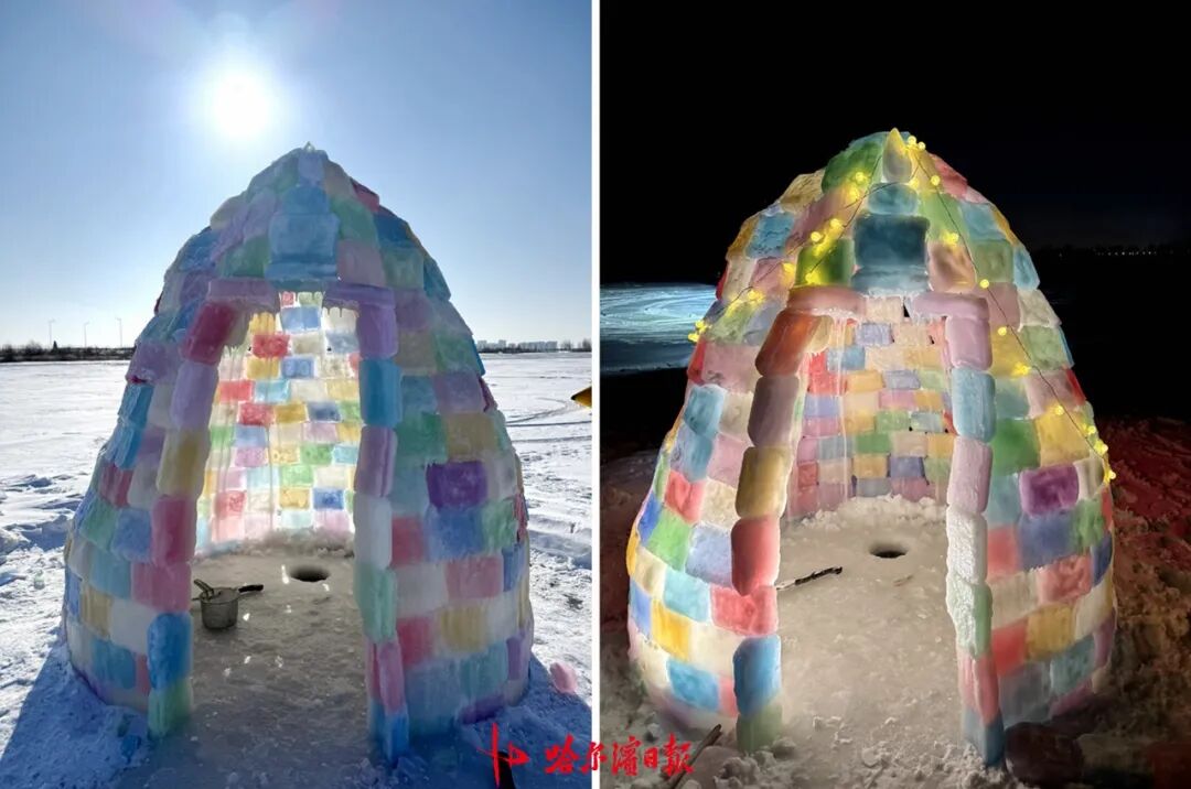 最近,呼兰区菜园子渔村江段冰层上,“长”出一间五彩缤纷的小冰屋。夜晚的彩灯透过冰砖,在白雪皑皑的天地间散开一片浪漫光晕。谁能想到,曾因搭建中途“翻车”,被网友戏称为“冰上茅楼儿”的这间冰屋,却意外走红,至今仍被无数网友“云监工”和游客慕名打卡。