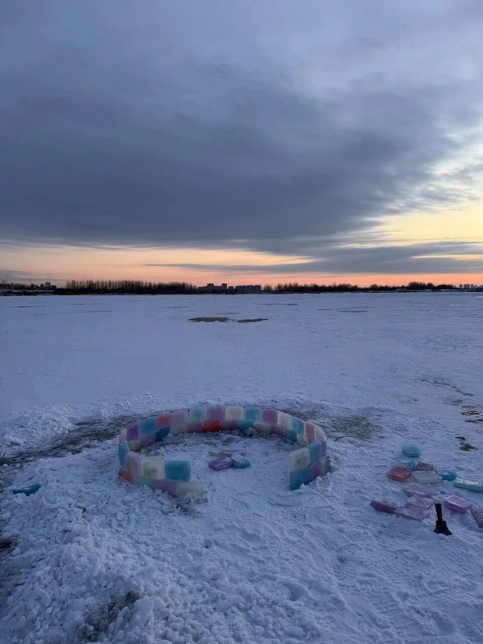 原来,热衷户外运动的她,拥有全套钓鱼帐、充气帐、柴火炉等装备,却总觉得“窝在帐篷里吃火锅看不到冰景太可惜”。为了让南方游客既能感受冰雪的纯净,又能体验围炉夜话的温暖,她突发奇想:用环保食用色素冻出五颜六色的冰砖,搭建一座“透明帐篷”式的彩色冰屋,让游客在里面既能冰钓又能涮火锅。