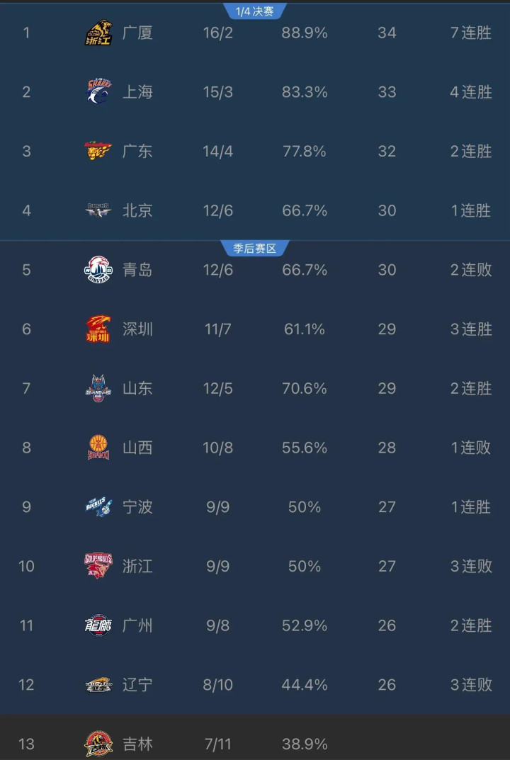 今夜一战后,CBA排名也发生变化,辽宁遭遇3连败,排名跌到第12,仅领先第13的吉林1个胜场,季后赛资格岌岌可危。山东两连胜反超山西来到第7,不过4-7名北京、青岛、深圳、山东仅差一场,联赛第4的争夺更加激烈。上海迎来4连胜,继续稳住了第2的位置。