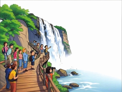 挤过东谈主群,壮不雅的瀑布终于展当今咫尺。它像一匹纷乱的白色丝绸,从陡壁之巅飞流直下,阵容磅礴,蔚为壮不雅。我不禁吟哦起李白的诗句:“飞流直下三千尺,疑是星河落九天。” 水流从高高的山崖流泻而下,撞击在岩石上,溅起大量剔透皎洁的浪花,朦胧的水雾环绕着山崖,也轻抚着每一位旅客。